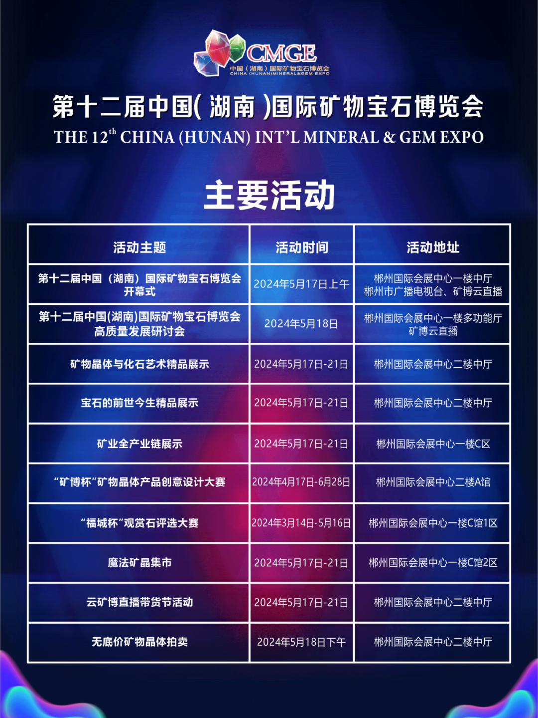 5月17-21日!第十二屆中國(湖南)國際礦物寶石博覽會(huì)亮相郴州!超多精彩現(xiàn)場(chǎng)呈現(xiàn),五天展會(huì),為您帶來一場(chǎng)礦物行業(yè)的盛會(huì)!讓我們一起期待吧!