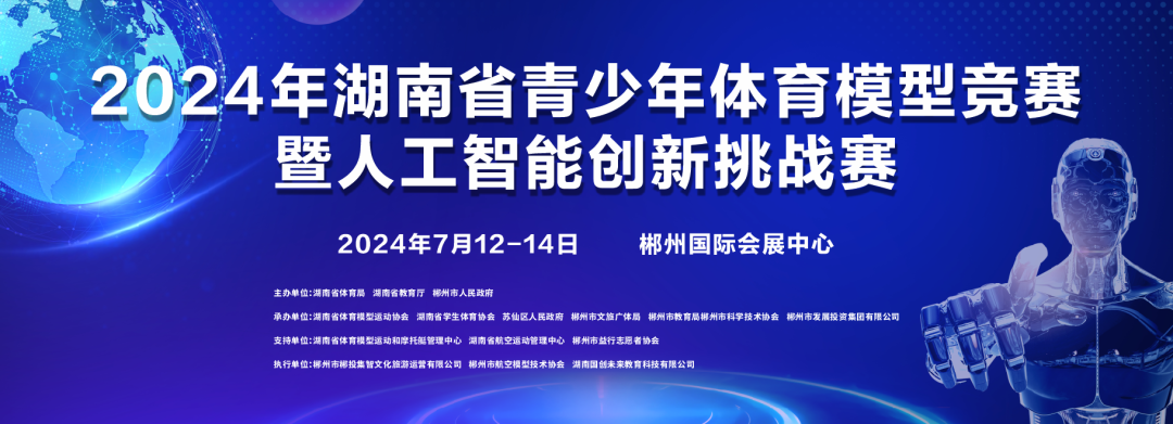 為深入貫徹習(xí)近平總書記在考察湖南的重要講話和指示批示精神,進(jìn)一步落實(shí)2024年全省體育工作會(huì)議關(guān)于深化體教融合,培養(yǎng)青少年愛祖國(guó)、愛科學(xué)、愛運(yùn)動(dòng)的情懷,促進(jìn)青少年對(duì)航空航天模型及人工智能技術(shù)的興趣,培養(yǎng)創(chuàng)新能力和實(shí)踐能力,提高青少年創(chuàng)新意識(shí)和科學(xué)素養(yǎng)等相關(guān)工作,經(jīng)多方爭(zhēng)取和努力,2024年湖南省青少年體育模型競(jìng)賽暨人工智能創(chuàng)新挑戰(zhàn)賽將于2024年7月12日-7月14日在郴州市國(guó)際會(huì)展中心和郴州市體育館正式開賽!