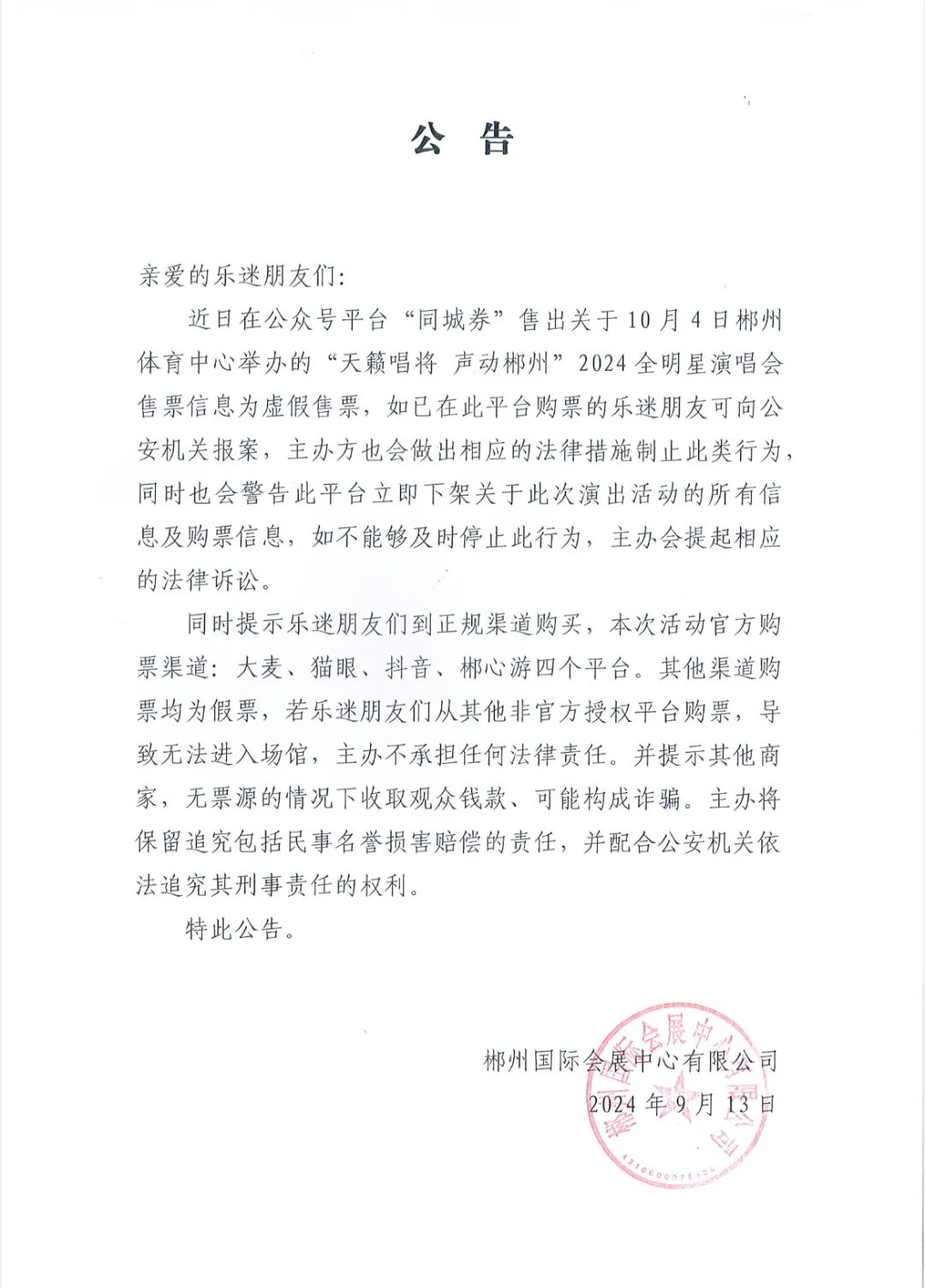 同時提示樂迷朋友們到正規(guī)渠道購買,本次活動官方購票渠道:大麥、貓眼、抖音、郴心游四個平臺。其他渠道購票均為假票,若樂迷朋友們從其他非官方授權(quán)平臺購票,導(dǎo)致無法進入場館,主辦不承擔任何法律責任。并提示其他商家,無票源的情況下收取觀眾錢款、可能構(gòu)成詐騙。主辦將保留追究包括民事名譽損害賠償?shù)呢熑危⑴浜瞎矙C關(guān)依法追究其刑事責任的權(quán)利。