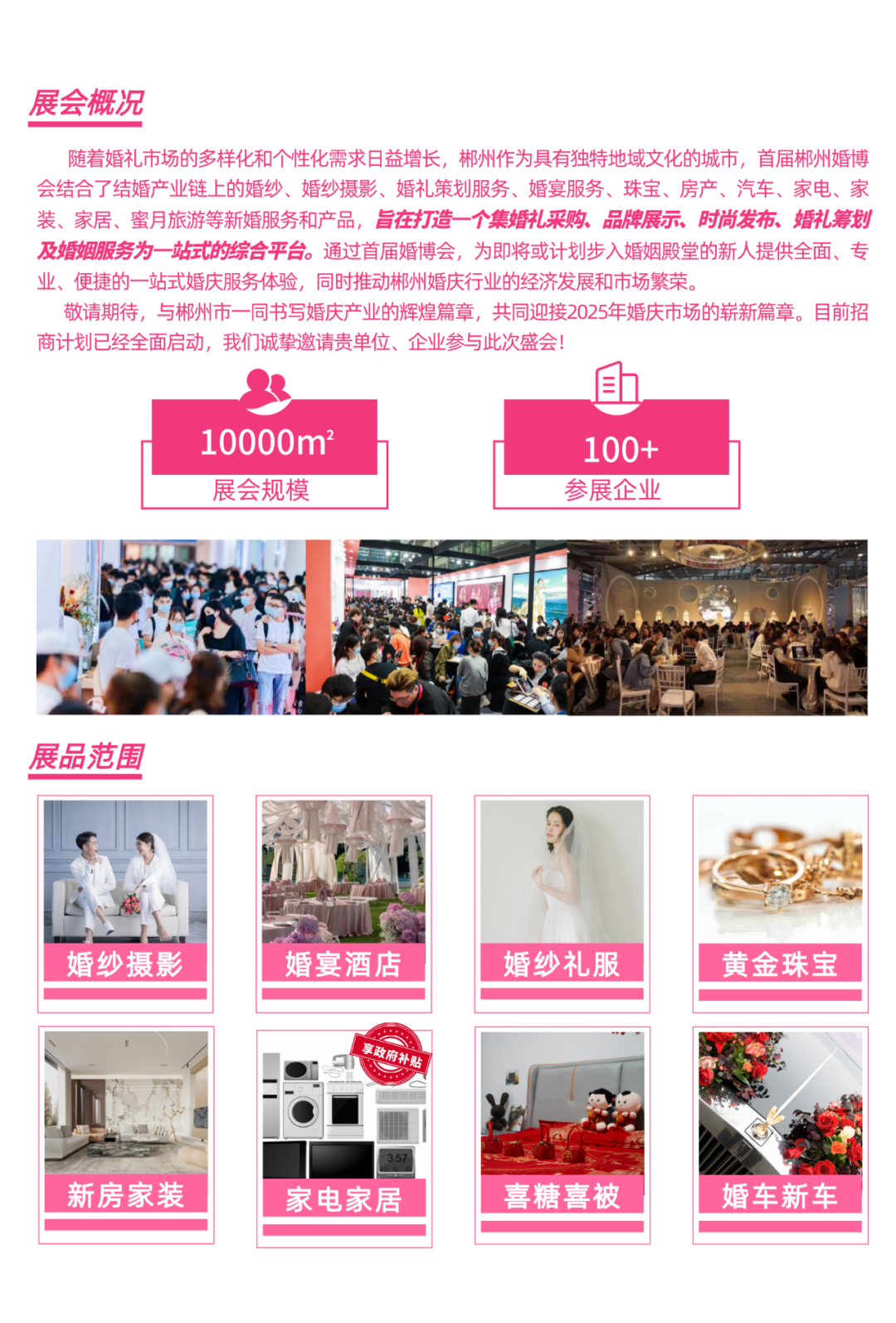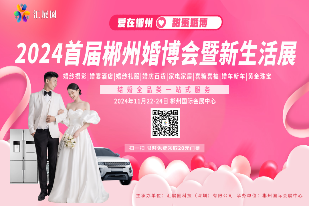 11月22日-24日,由郴州市商務局、郴州市會展局指導,匯展圈科技(深圳)有限公司主辦,郴州國際會展中心、匯展圈科技(深圳)有限公司承辦,以“愛在郴州·甜蜜婚博”為主題的首屆郴州婚博會暨新生活展將在郴州國際會展中心舉行!